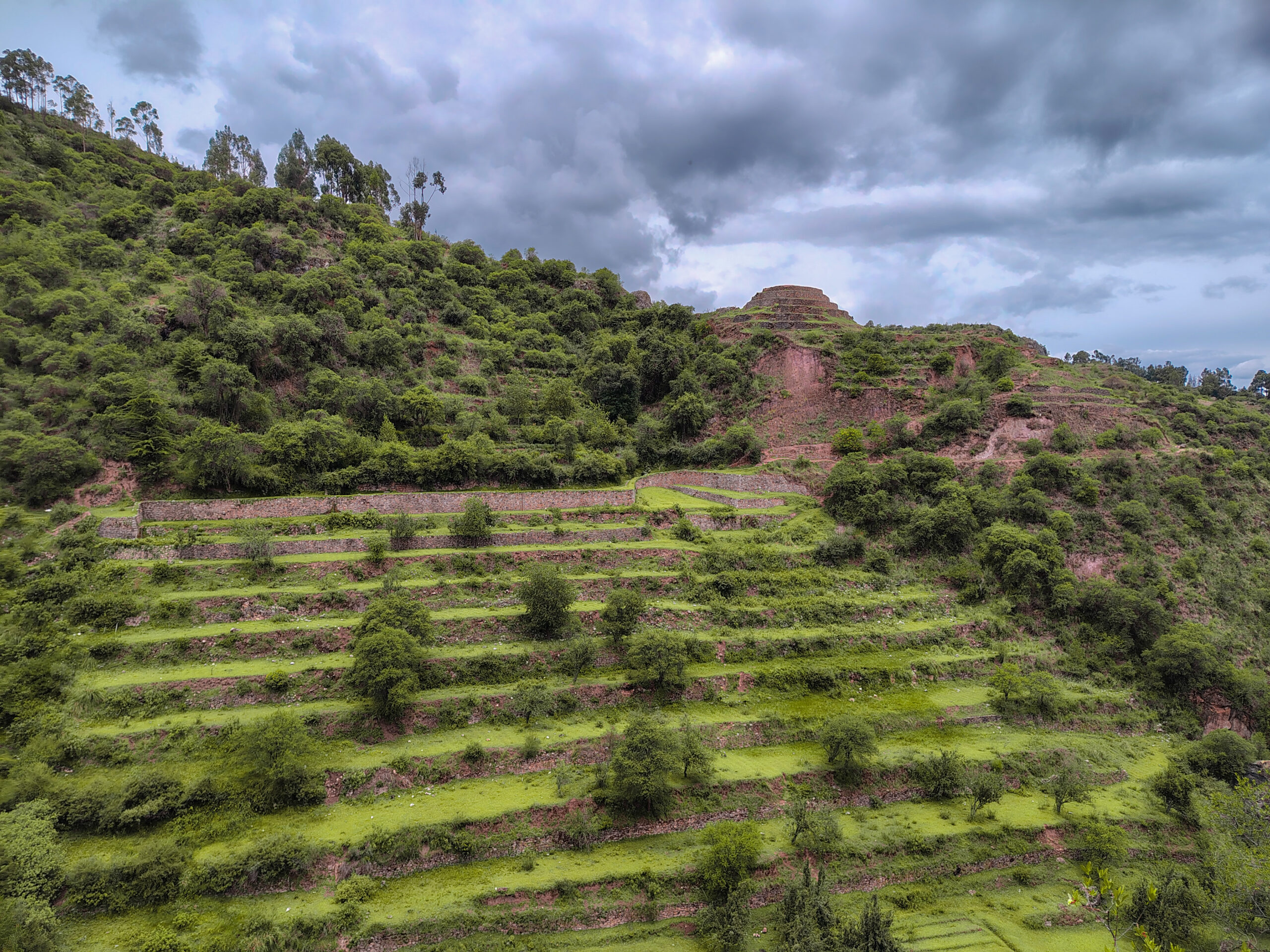Aunque no forma parte principal de la ruta a Inkilltambo es posible verlo de lejos, una pirámide circular que servía como centro ceremonial rodeado de andenes.